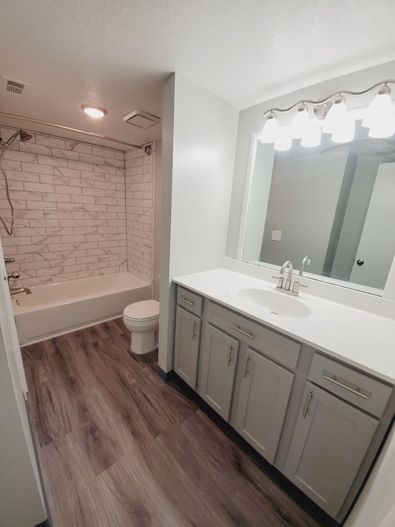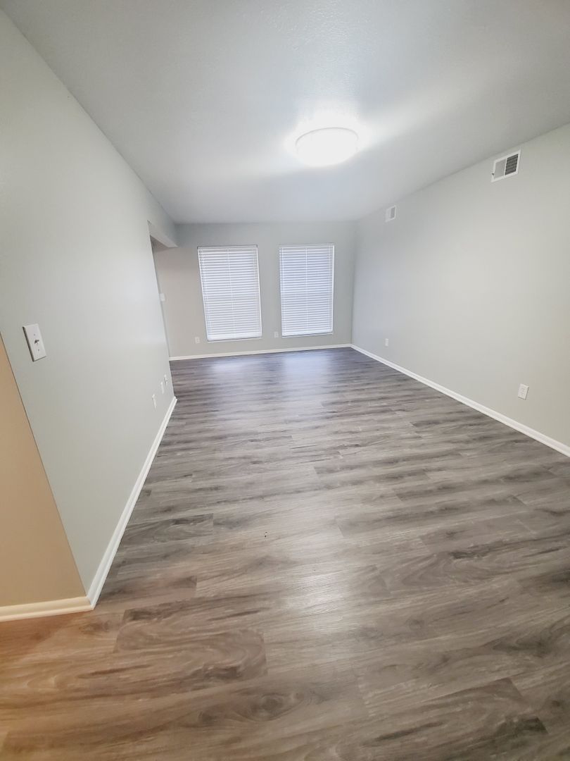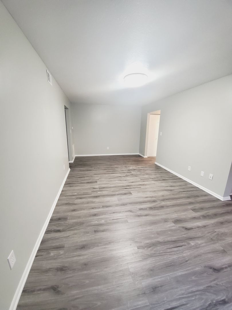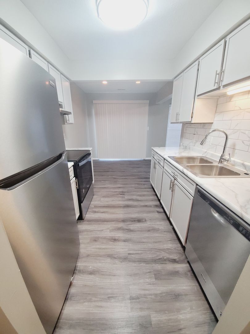 This apartment has refurbished grey cabinets with new laminate counter tops. Stainless steel appliances, luxury vinyl plank flooring, ceiling lights in every room, faux wood blinds, remodeled bathroom, and grey walls with bright white ceilings and trim.