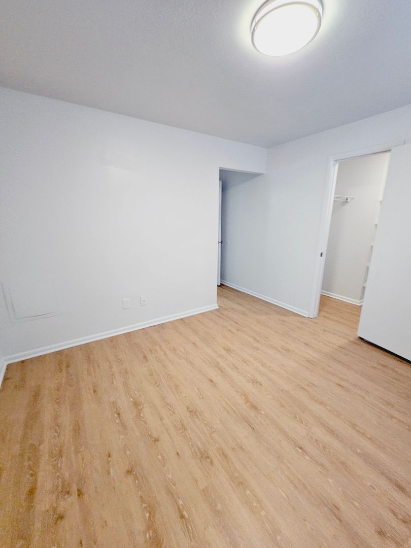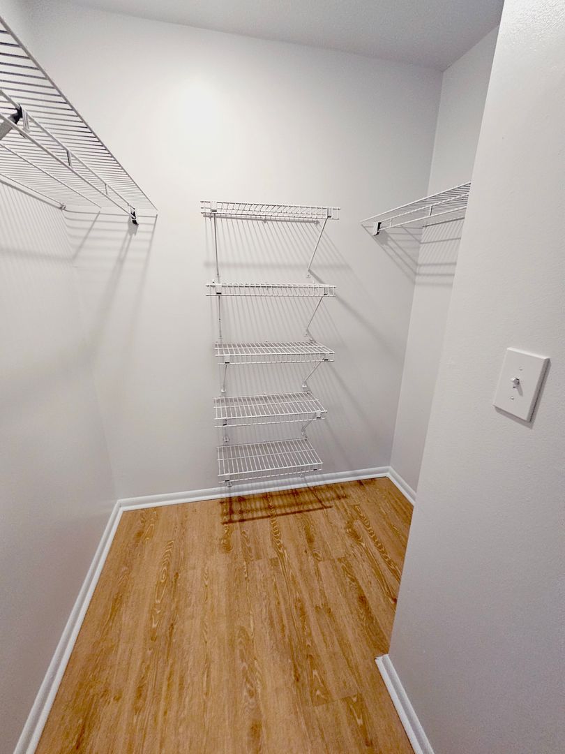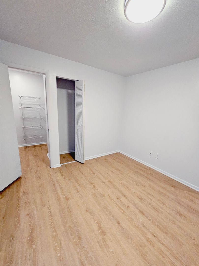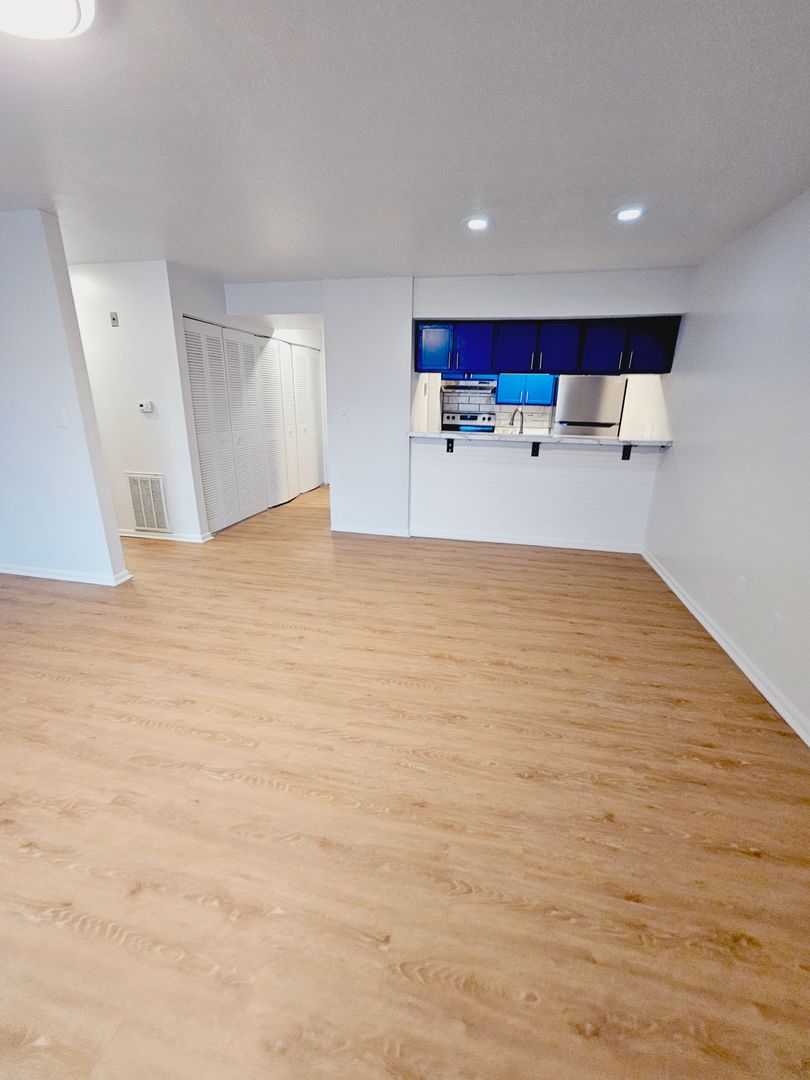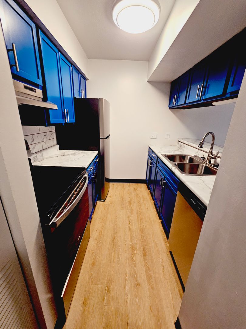 This 2 bed 2 bath has blue painted cabinets, a marble laminate top, stainless steel appliances, beautiful backsplash, luxury vinyl plank flooring, electric fireplace, faux wood blinds, ceiling lights in every room, walk in closets, and remodeled bathrooms.