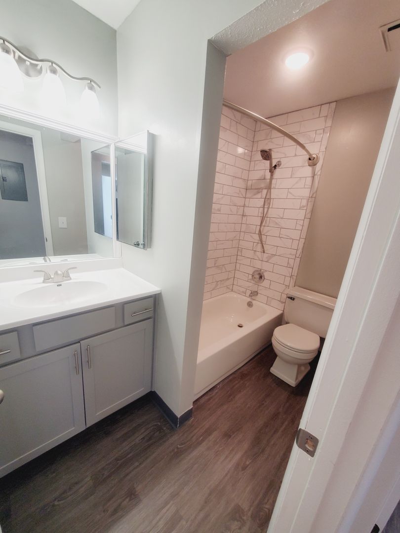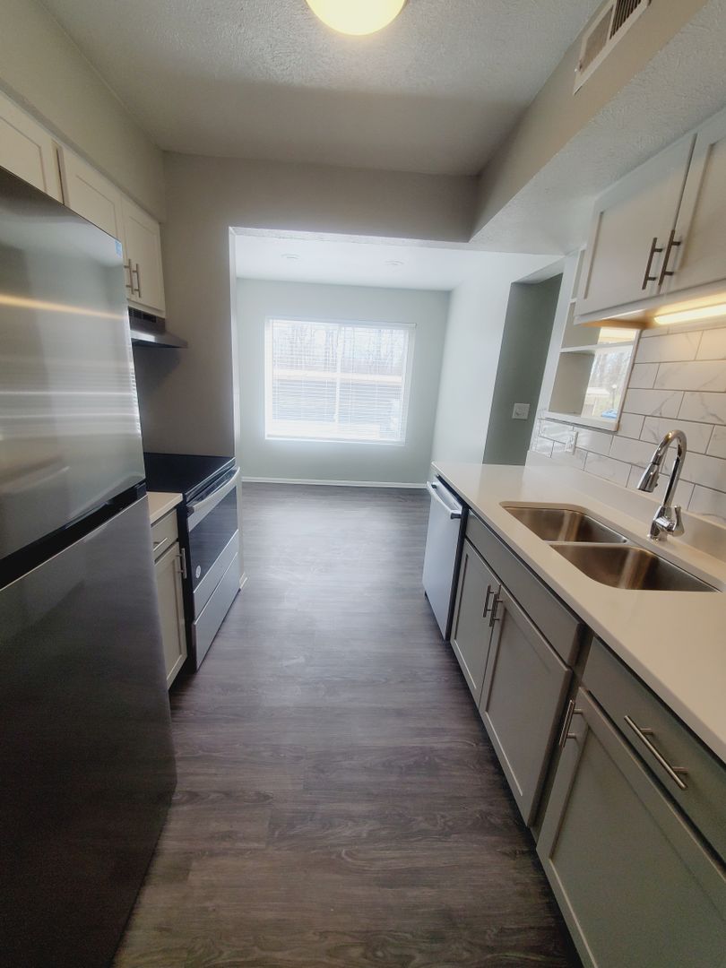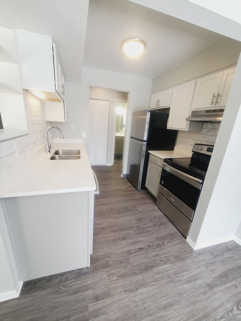 This apartment has newer two tone cabinets, quartz counter tops, luxury vinyl plank flooring, stainless steel appliances, ceiling lights in every room, faux wood blinds, and a remodeled bathroom. You will fall in love once you see it!